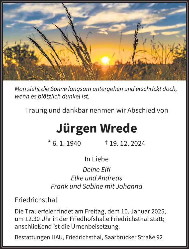 Hier finden Sie alle Traueranzeigen aus der Zeitung, die bisher für Jürgen Wrede erschienen sind. Weitere Traueranzeigen, die in der Zeitung erscheinen, werden hier ebenfalls aufgelistet