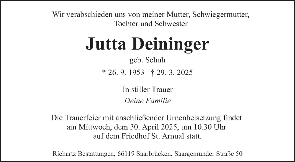 Hier finden Sie alle Traueranzeigen aus der Zeitung, die bisher für Jutta Deininger erschienen sind. Weitere Traueranzeigen, die in der Zeitung erscheinen, werden hier ebenfalls aufgelistet