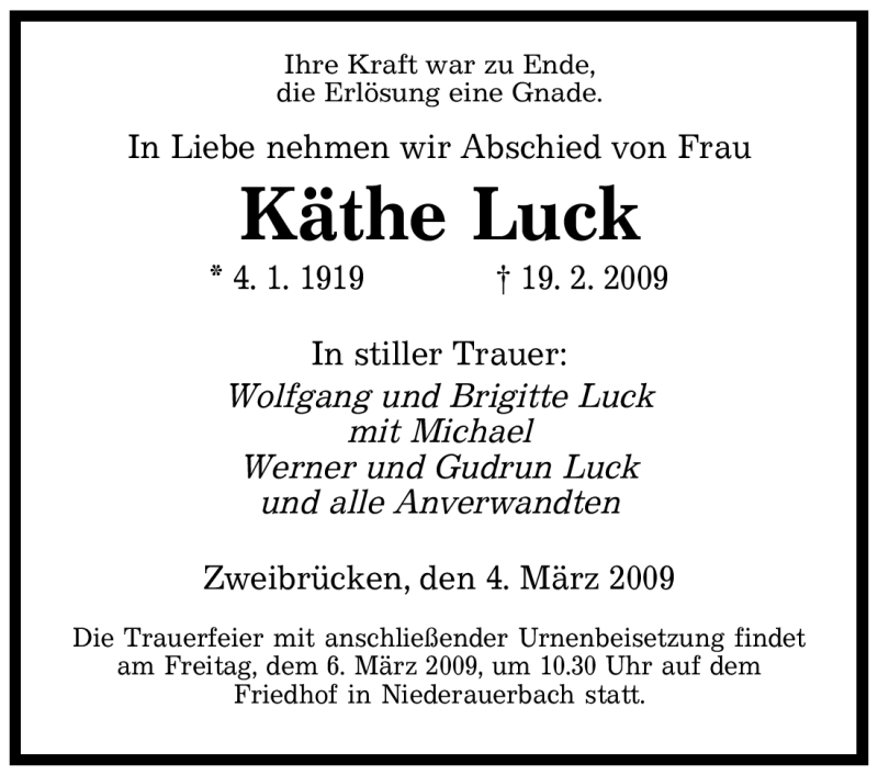 Hier finden Sie alle Traueranzeigen aus der Zeitung, die bisher für Käthe Luck erschienen sind. Weitere Traueranzeigen, die in der Zeitung erscheinen, werden hier ebenfalls aufgelistet