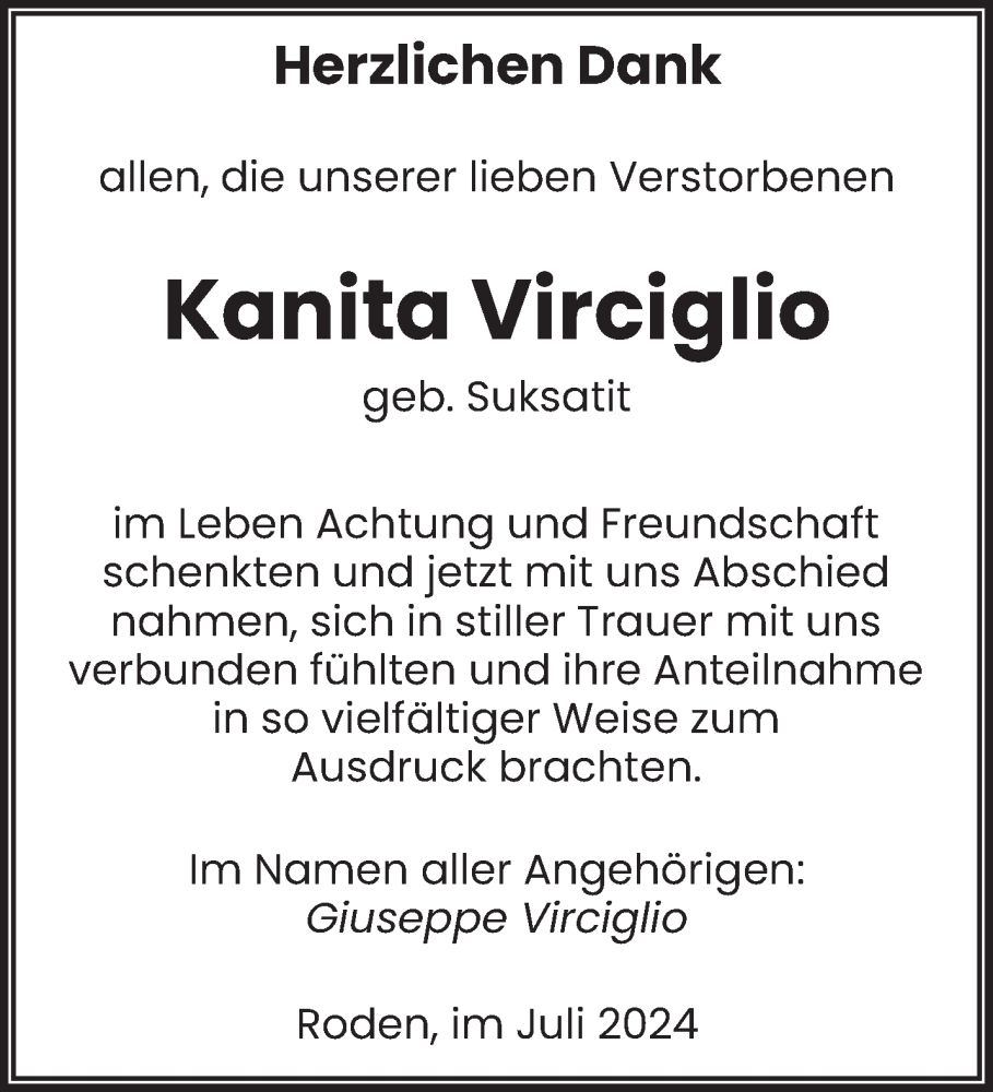 Hier finden Sie alle Traueranzeigen aus der Zeitung, die bisher für Kanita Virciglio erschienen sind. Weitere Traueranzeigen, die in der Zeitung erscheinen, werden hier ebenfalls aufgelistet