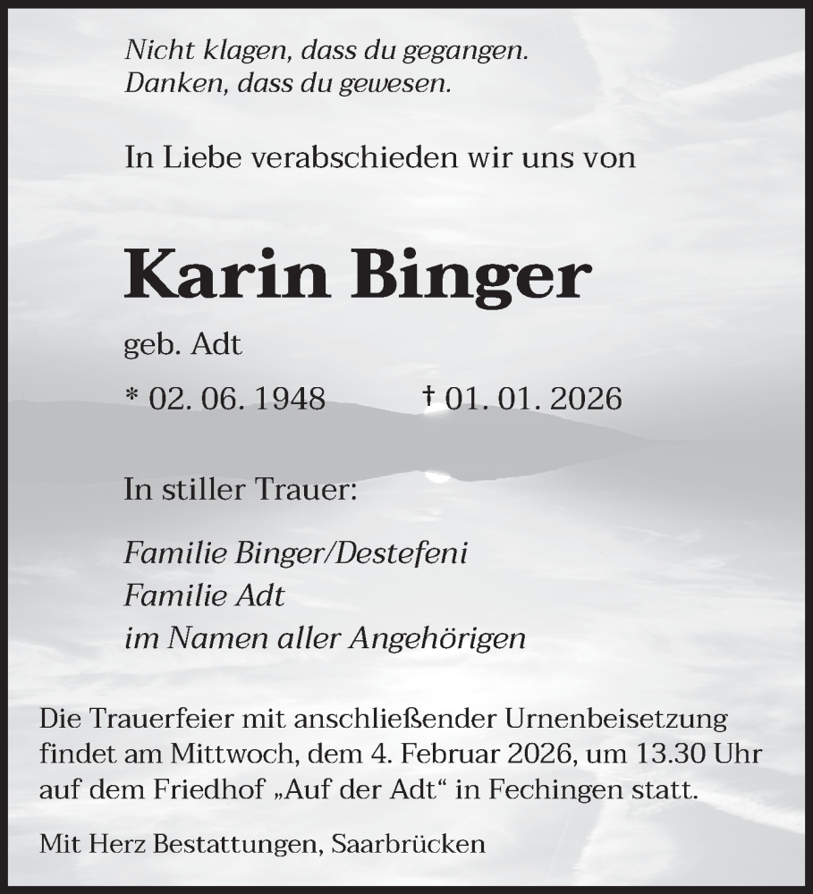Hier finden Sie alle Traueranzeigen aus der Zeitung, die bisher für Karin Binger erschienen sind. Weitere Traueranzeigen, die in der Zeitung erscheinen, werden hier ebenfalls aufgelistet