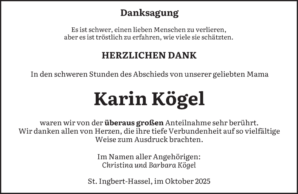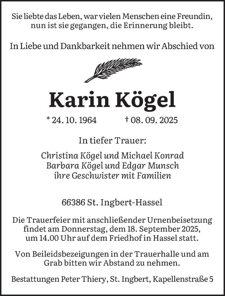 Hier finden Sie alle Traueranzeigen aus der Zeitung, die bisher für Karin Kögel erschienen sind. Weitere Traueranzeigen, die in der Zeitung erscheinen, werden hier ebenfalls aufgelistet