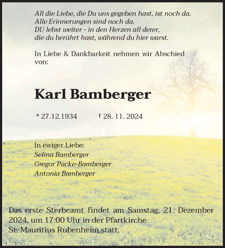 Hier finden Sie alle Traueranzeigen aus der Zeitung, die bisher für Karl Bamberger erschienen sind. Weitere Traueranzeigen, die in der Zeitung erscheinen, werden hier ebenfalls aufgelistet