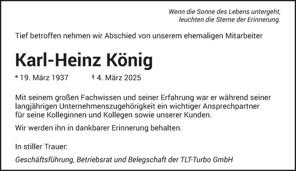 Hier finden Sie alle Traueranzeigen aus der Zeitung, die bisher für Karl-Heinz König erschienen sind. Weitere Traueranzeigen, die in der Zeitung erscheinen, werden hier ebenfalls aufgelistet