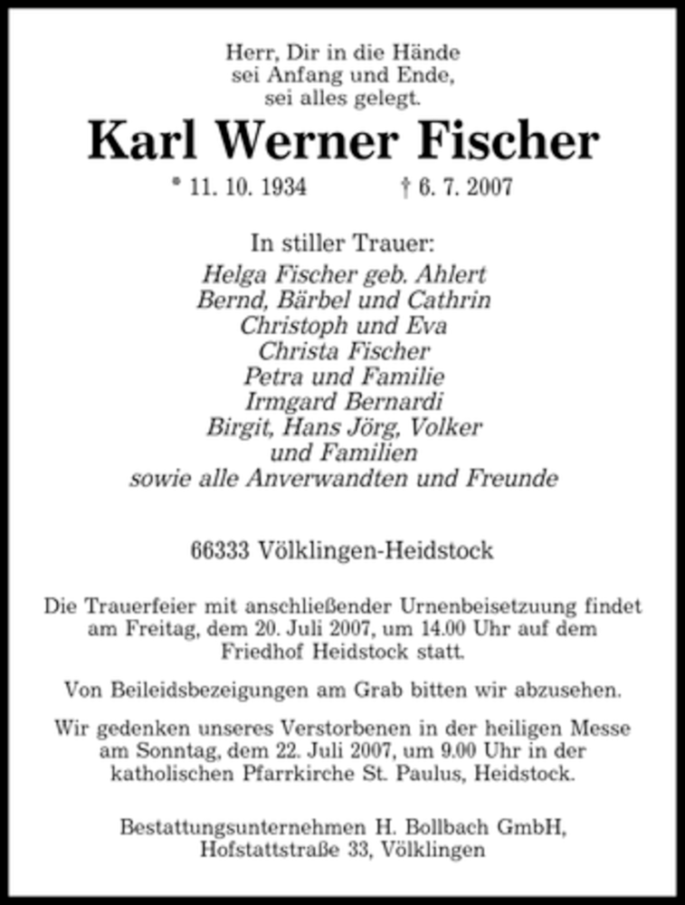 Hier finden Sie alle Traueranzeigen aus der Zeitung, die bisher für Karl Werner Fischer erschienen sind. Weitere Traueranzeigen, die in der Zeitung erscheinen, werden hier ebenfalls aufgelistet