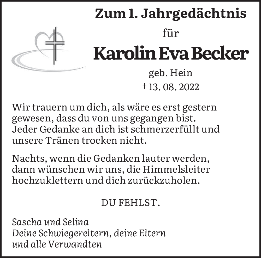 Hier finden Sie alle Traueranzeigen aus der Zeitung, die bisher für Karolin Eva Becker erschienen sind. Weitere Traueranzeigen, die in der Zeitung erscheinen, werden hier ebenfalls aufgelistet