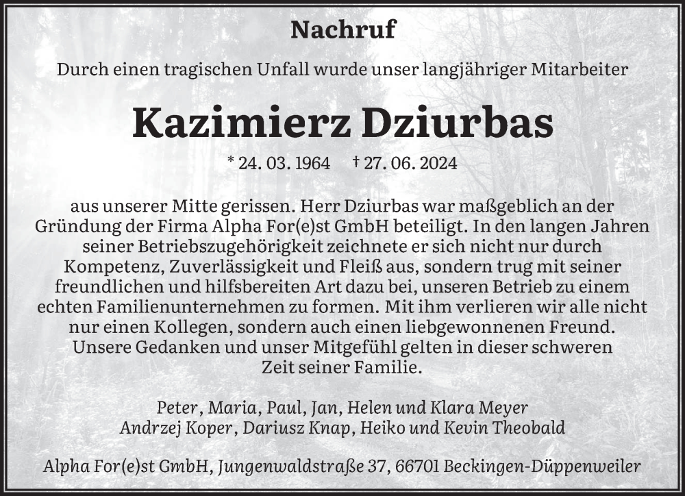 Hier finden Sie alle Traueranzeigen aus der Zeitung, die bisher für Kazimierz Dziurbas erschienen sind. Weitere Traueranzeigen, die in der Zeitung erscheinen, werden hier ebenfalls aufgelistet
