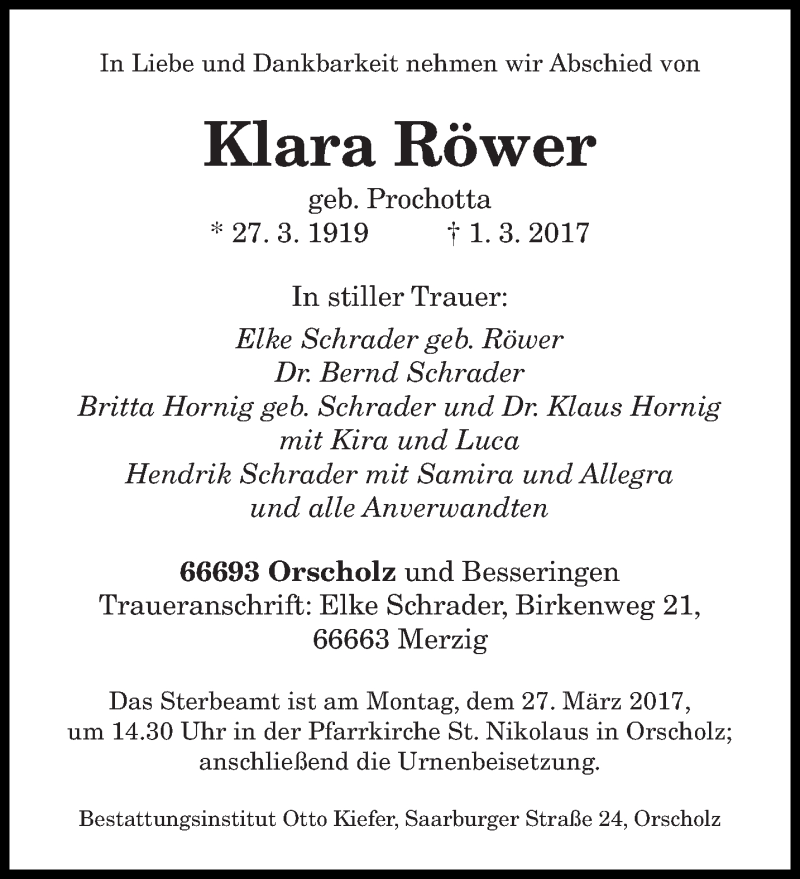 Hier finden Sie alle Traueranzeigen aus der Zeitung, die bisher für Klara Röwer erschienen sind. Weitere Traueranzeigen, die in der Zeitung erscheinen, werden hier ebenfalls aufgelistet