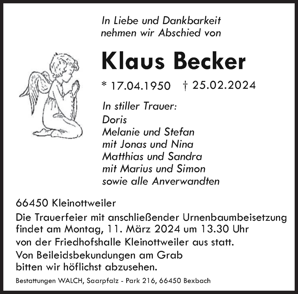 Hier finden Sie alle Traueranzeigen aus der Zeitung, die bisher für Klaus Becker erschienen sind. Weitere Traueranzeigen, die in der Zeitung erscheinen, werden hier ebenfalls aufgelistet