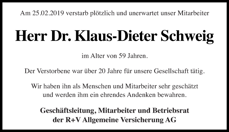 Hier finden Sie alle Traueranzeigen aus der Zeitung, die bisher für Klaus-Dieter Schweig erschienen sind. Weitere Traueranzeigen, die in der Zeitung erscheinen, werden hier ebenfalls aufgelistet