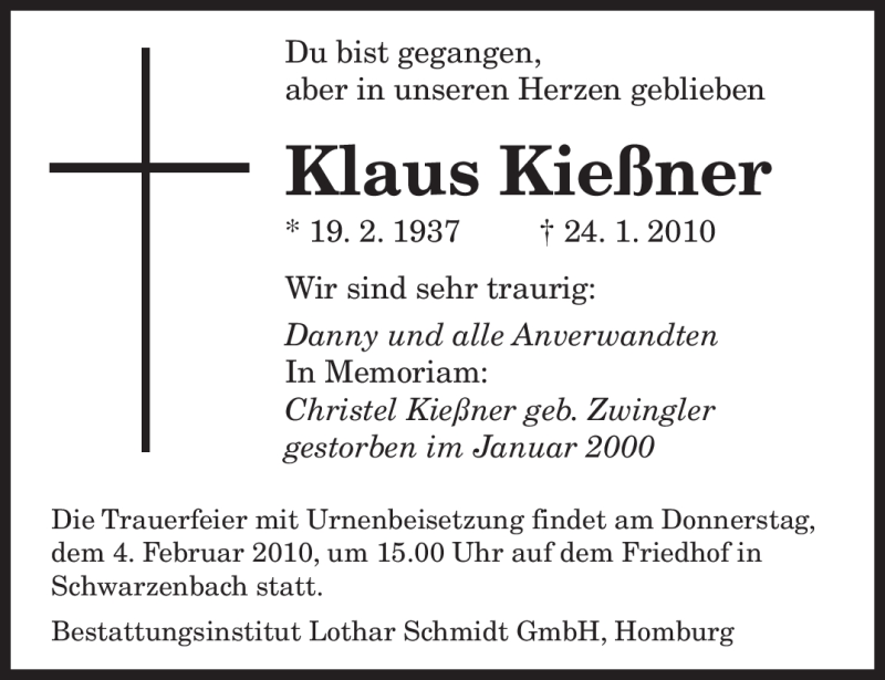Hier finden Sie alle Traueranzeigen aus der Zeitung, die bisher für Klaus Kießner erschienen sind. Weitere Traueranzeigen, die in der Zeitung erscheinen, werden hier ebenfalls aufgelistet