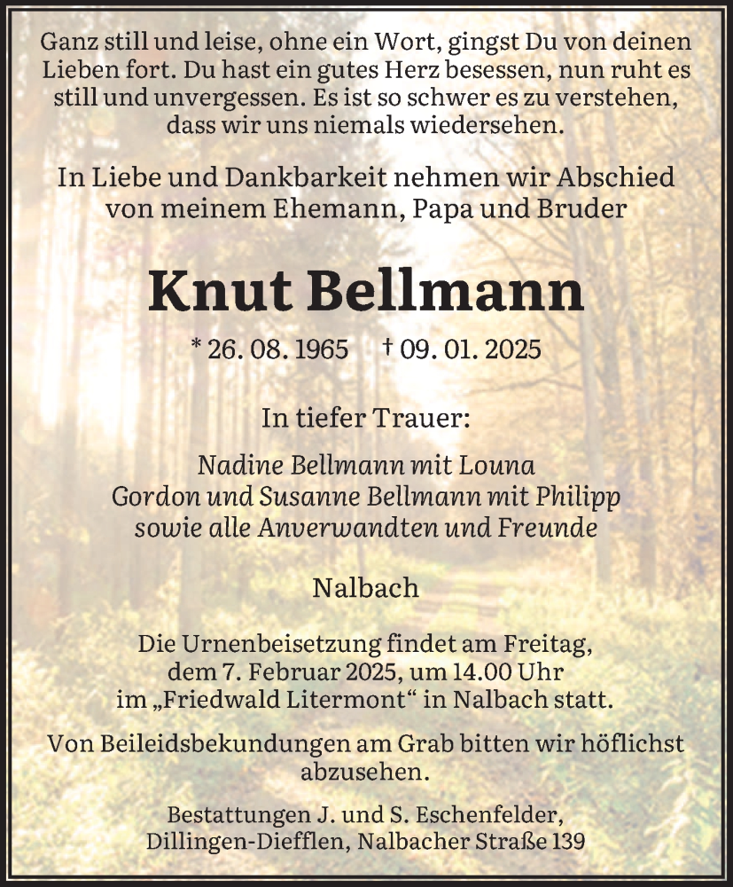 Hier finden Sie alle Traueranzeigen aus der Zeitung, die bisher für Knut Bellmann erschienen sind. Weitere Traueranzeigen, die in der Zeitung erscheinen, werden hier ebenfalls aufgelistet