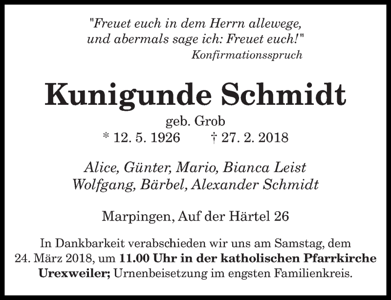 Hier finden Sie alle Traueranzeigen aus der Zeitung, die bisher für Kunigunde Schmidt erschienen sind. Weitere Traueranzeigen, die in der Zeitung erscheinen, werden hier ebenfalls aufgelistet