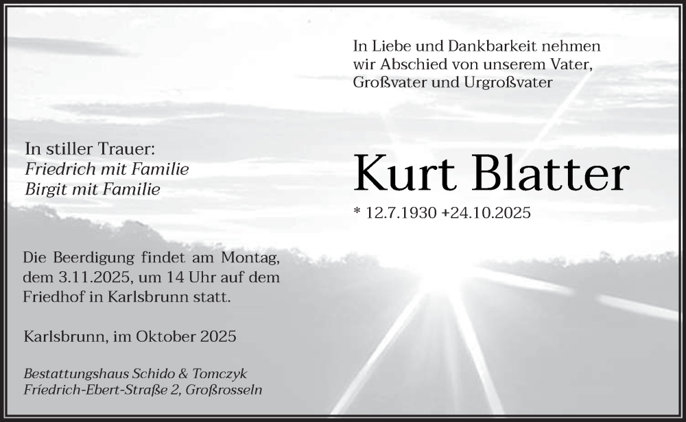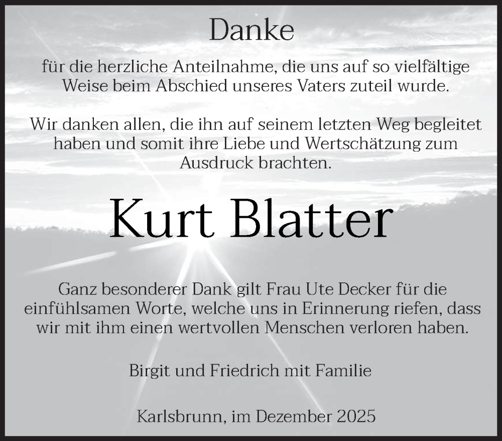 Hier finden Sie alle Traueranzeigen aus der Zeitung, die bisher für Kurt Blatter erschienen sind. Weitere Traueranzeigen, die in der Zeitung erscheinen, werden hier ebenfalls aufgelistet