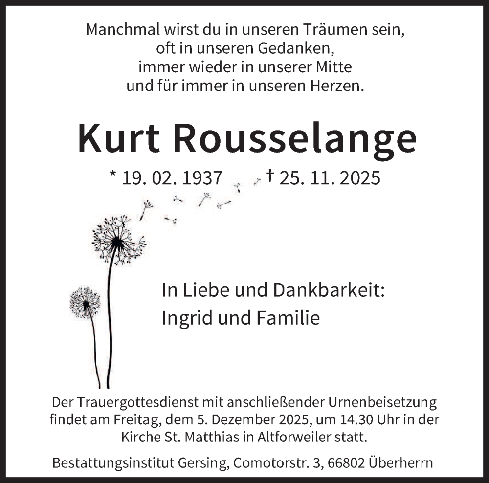 Hier finden Sie alle Traueranzeigen aus der Zeitung, die bisher für Kurt Rousselange erschienen sind. Weitere Traueranzeigen, die in der Zeitung erscheinen, werden hier ebenfalls aufgelistet