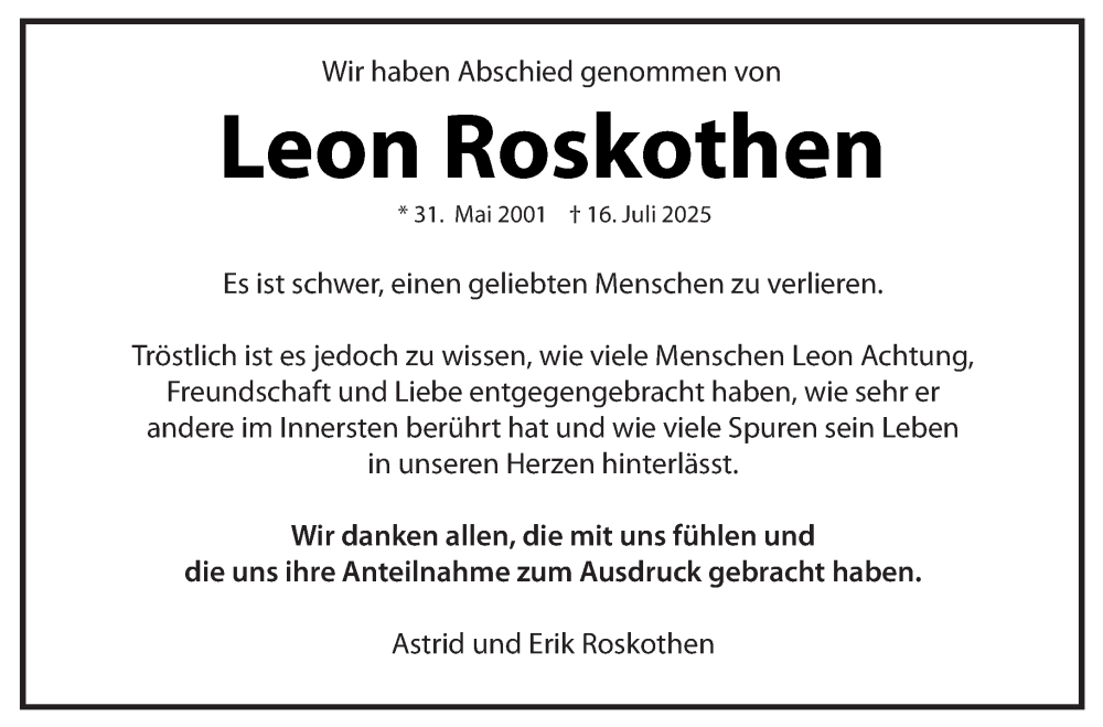 Hier finden Sie alle Traueranzeigen aus der Zeitung, die bisher für Leon Roskothen erschienen sind. Weitere Traueranzeigen, die in der Zeitung erscheinen, werden hier ebenfalls aufgelistet