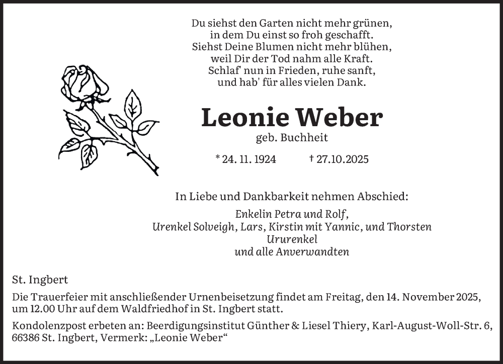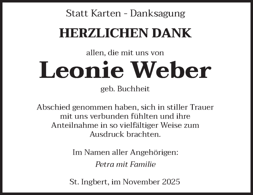 Hier finden Sie alle Traueranzeigen aus der Zeitung, die bisher für Leonie Weber erschienen sind. Weitere Traueranzeigen, die in der Zeitung erscheinen, werden hier ebenfalls aufgelistet