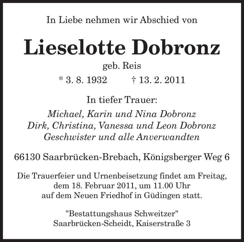 Hier finden Sie alle Traueranzeigen aus der Zeitung, die bisher für Lieselotte Dobronz erschienen sind. Weitere Traueranzeigen, die in der Zeitung erscheinen, werden hier ebenfalls aufgelistet