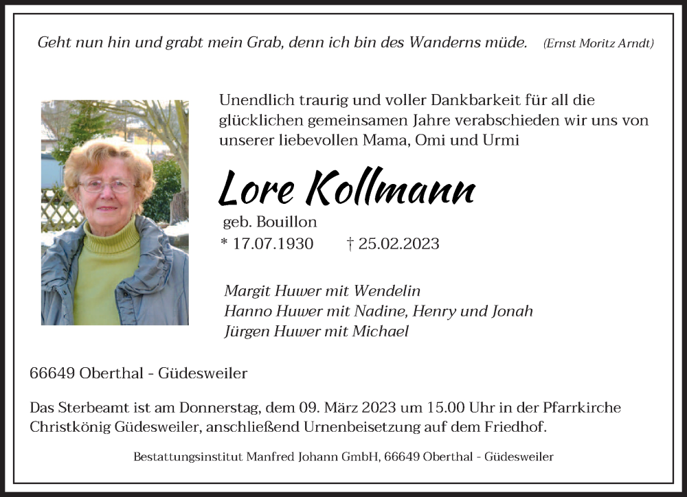 Hier finden Sie alle Traueranzeigen aus der Zeitung, die bisher für Lore Kollmann erschienen sind. Weitere Traueranzeigen, die in der Zeitung erscheinen, werden hier ebenfalls aufgelistet