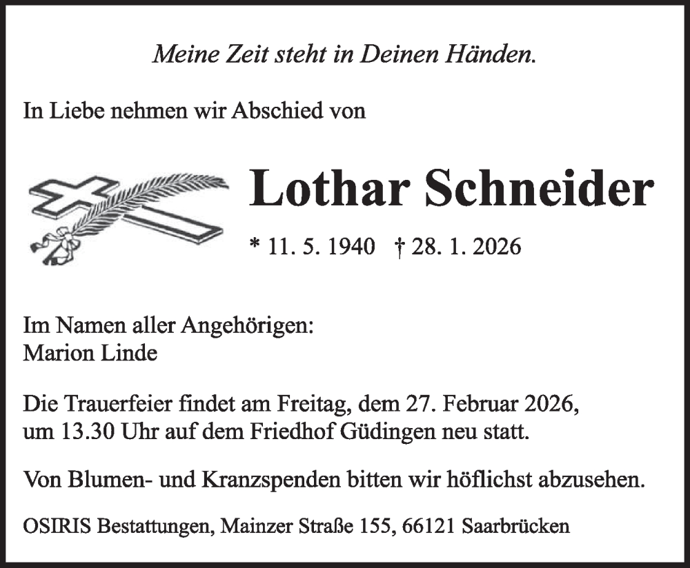 Hier finden Sie alle Traueranzeigen aus der Zeitung, die bisher für Lothar Schneider erschienen sind. Weitere Traueranzeigen, die in der Zeitung erscheinen, werden hier ebenfalls aufgelistet