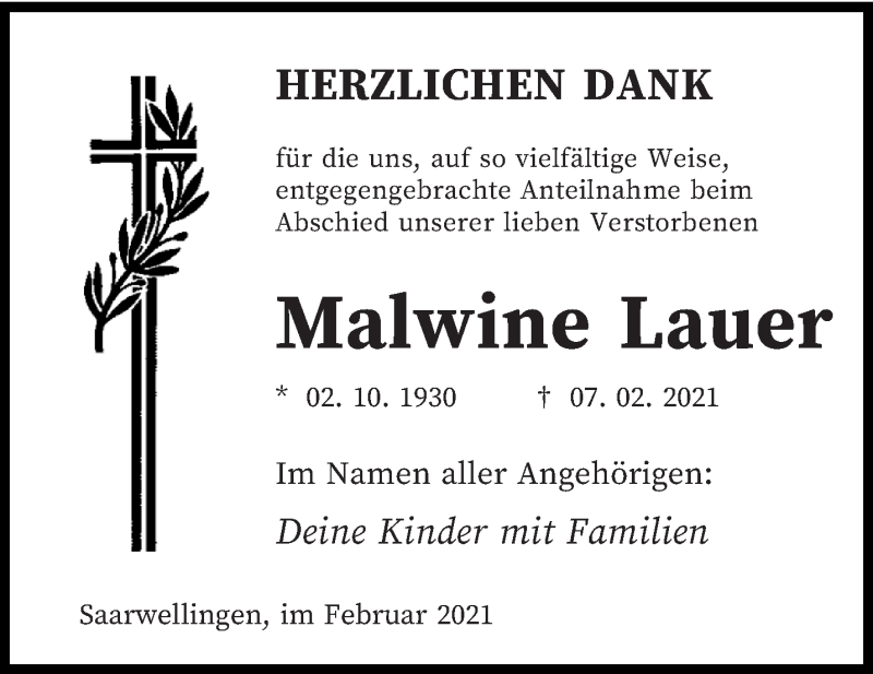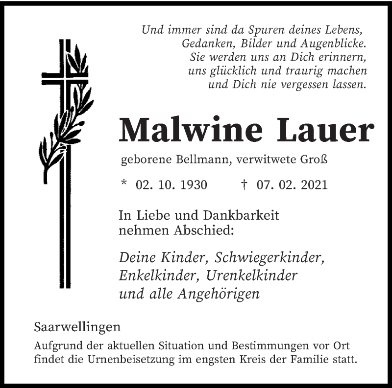 Hier finden Sie alle Traueranzeigen aus der Zeitung, die bisher für Malwine Lauer erschienen sind. Weitere Traueranzeigen, die in der Zeitung erscheinen, werden hier ebenfalls aufgelistet