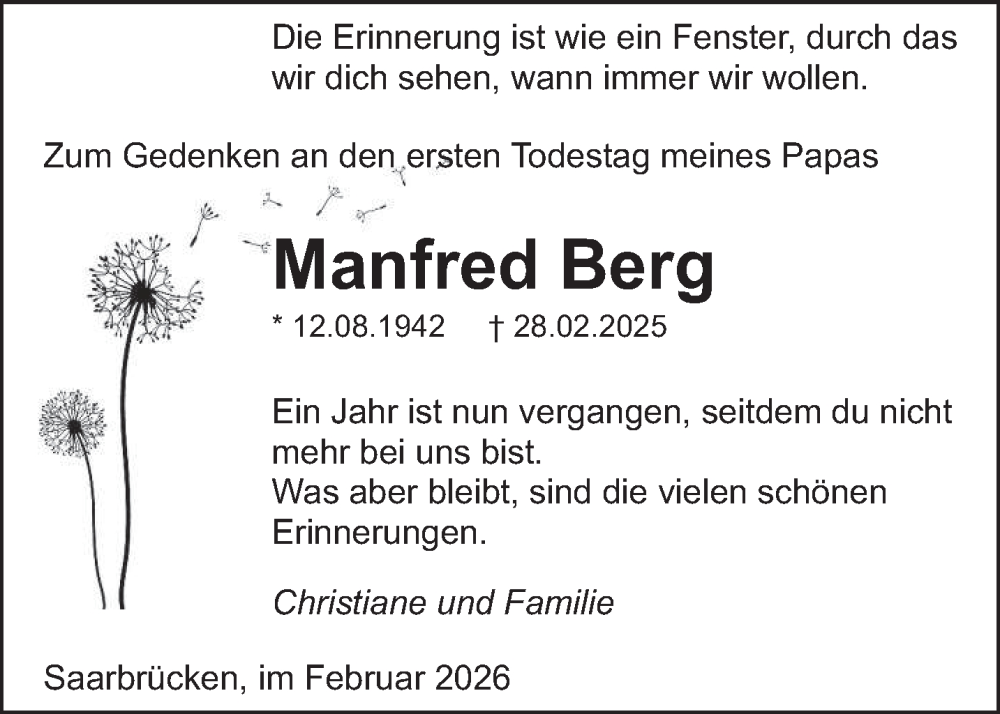 Hier finden Sie alle Traueranzeigen aus der Zeitung, die bisher für Manfred Berg erschienen sind. Weitere Traueranzeigen, die in der Zeitung erscheinen, werden hier ebenfalls aufgelistet
