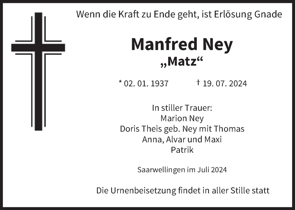 Hier finden Sie alle Traueranzeigen aus der Zeitung, die bisher für Manfred Ney erschienen sind. Weitere Traueranzeigen, die in der Zeitung erscheinen, werden hier ebenfalls aufgelistet