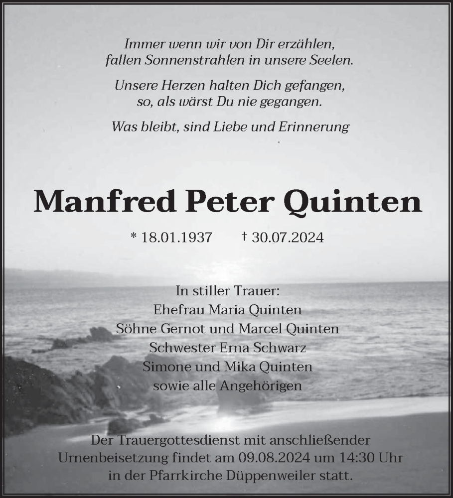 Hier finden Sie alle Traueranzeigen aus der Zeitung, die bisher für Manfred Peter Quinten erschienen sind. Weitere Traueranzeigen, die in der Zeitung erscheinen, werden hier ebenfalls aufgelistet