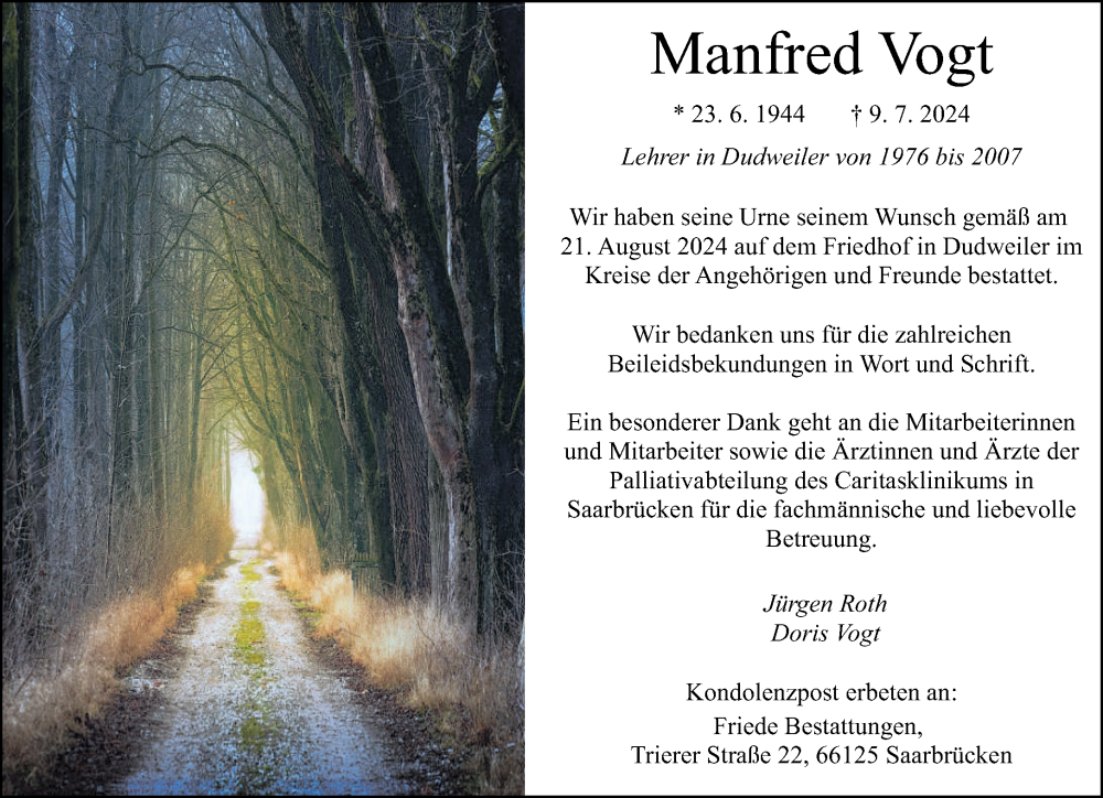 Hier finden Sie alle Traueranzeigen aus der Zeitung, die bisher für Manfred Vogt erschienen sind. Weitere Traueranzeigen, die in der Zeitung erscheinen, werden hier ebenfalls aufgelistet