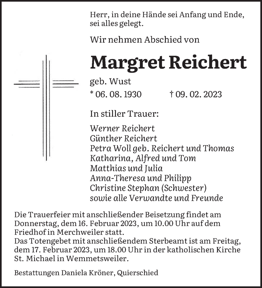 Hier finden Sie alle Traueranzeigen aus der Zeitung, die bisher für Margret Reichert erschienen sind. Weitere Traueranzeigen, die in der Zeitung erscheinen, werden hier ebenfalls aufgelistet