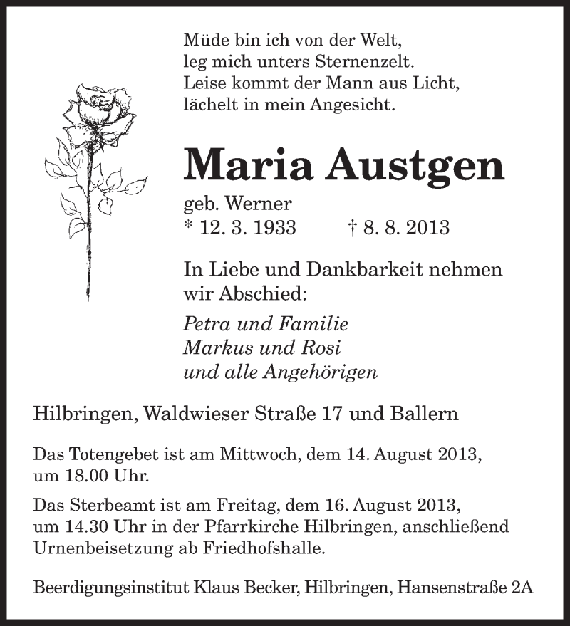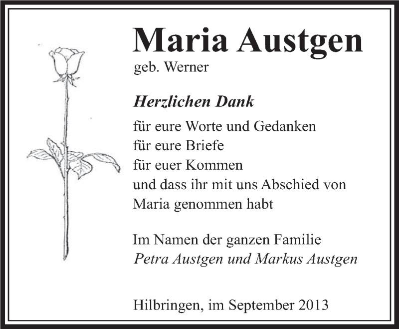 Hier finden Sie alle Traueranzeigen aus der Zeitung, die bisher für Maria Austgen erschienen sind. Weitere Traueranzeigen, die in der Zeitung erscheinen, werden hier ebenfalls aufgelistet