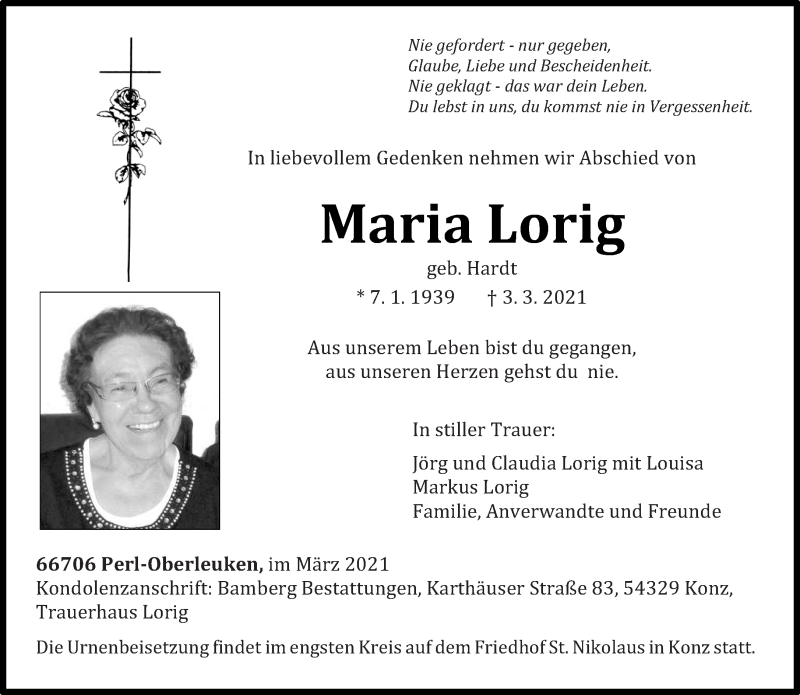 Hier finden Sie alle Traueranzeigen aus der Zeitung, die bisher für Maria Lorig erschienen sind. Weitere Traueranzeigen, die in der Zeitung erscheinen, werden hier ebenfalls aufgelistet