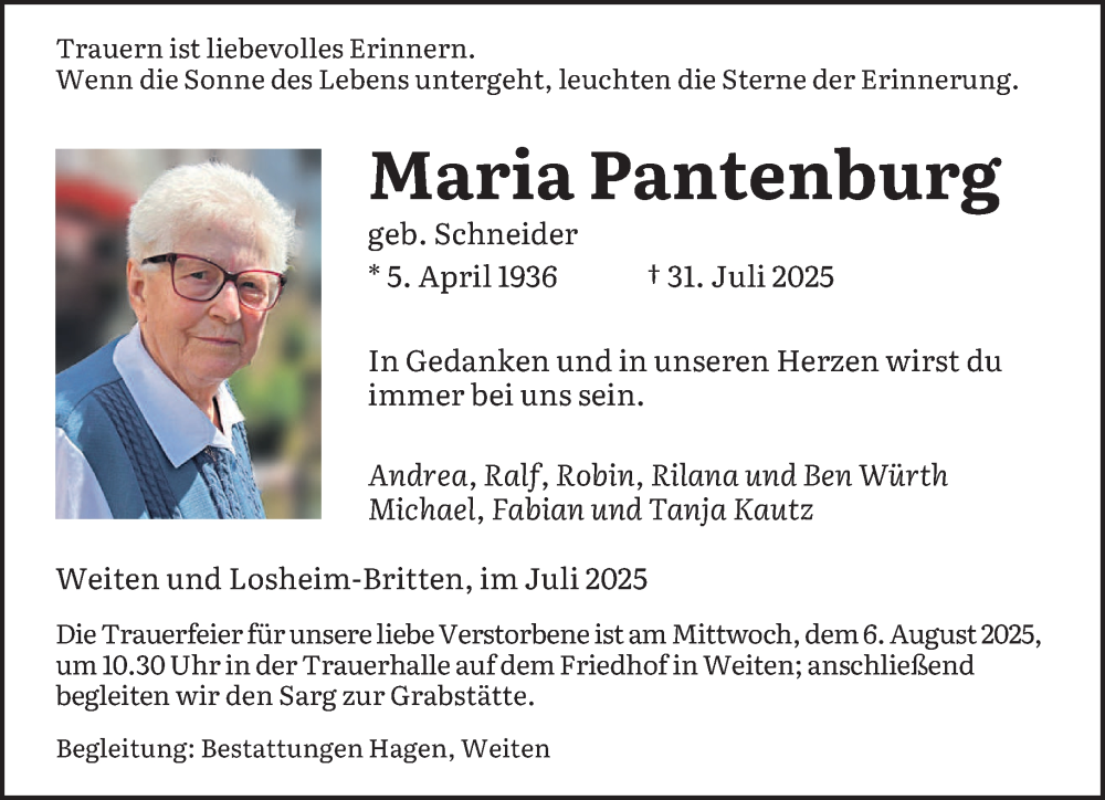 Hier finden Sie alle Traueranzeigen aus der Zeitung, die bisher für Maria Pantenburg erschienen sind. Weitere Traueranzeigen, die in der Zeitung erscheinen, werden hier ebenfalls aufgelistet
