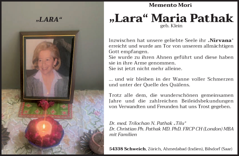 Hier finden Sie alle Traueranzeigen aus der Zeitung, die bisher für Maria Pathak erschienen sind. Weitere Traueranzeigen, die in der Zeitung erscheinen, werden hier ebenfalls aufgelistet