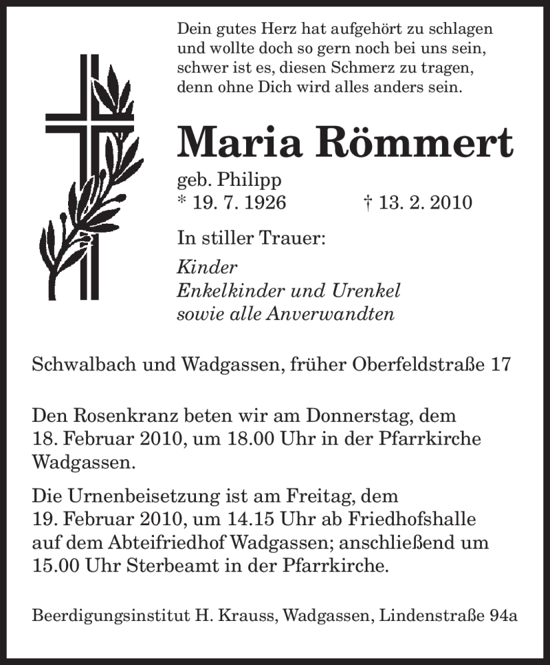 Hier finden Sie alle Traueranzeigen aus der Zeitung, die bisher für Maria Römmert erschienen sind. Weitere Traueranzeigen, die in der Zeitung erscheinen, werden hier ebenfalls aufgelistet
