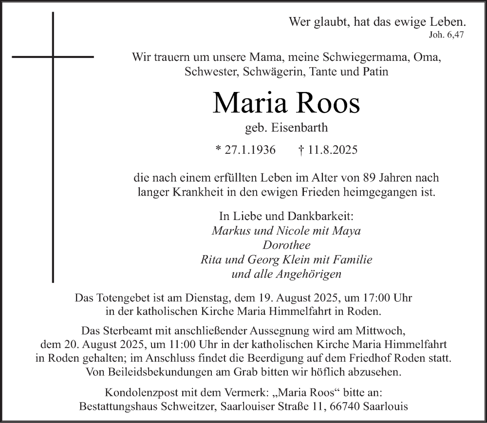 Hier finden Sie alle Traueranzeigen aus der Zeitung, die bisher für Maria Roos erschienen sind. Weitere Traueranzeigen, die in der Zeitung erscheinen, werden hier ebenfalls aufgelistet