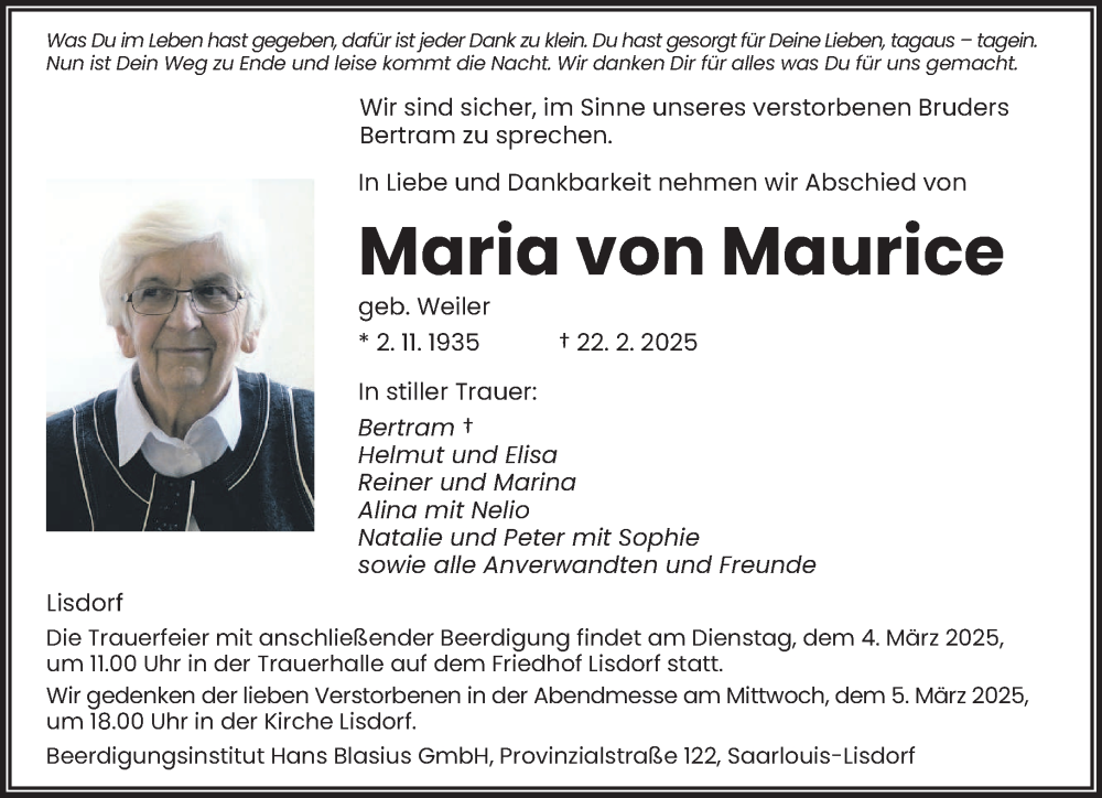 Hier finden Sie alle Traueranzeigen aus der Zeitung, die bisher für Maria von Maurice erschienen sind. Weitere Traueranzeigen, die in der Zeitung erscheinen, werden hier ebenfalls aufgelistet