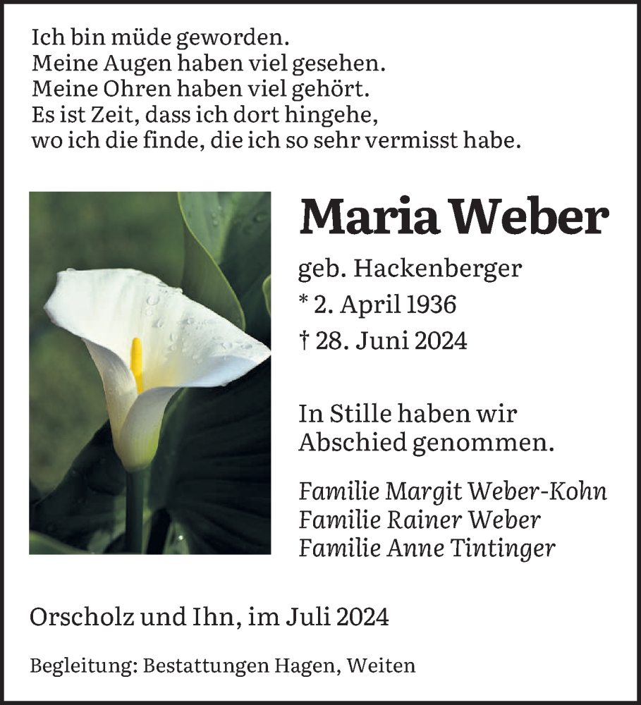 Hier finden Sie alle Traueranzeigen aus der Zeitung, die bisher für Maria Weber erschienen sind. Weitere Traueranzeigen, die in der Zeitung erscheinen, werden hier ebenfalls aufgelistet