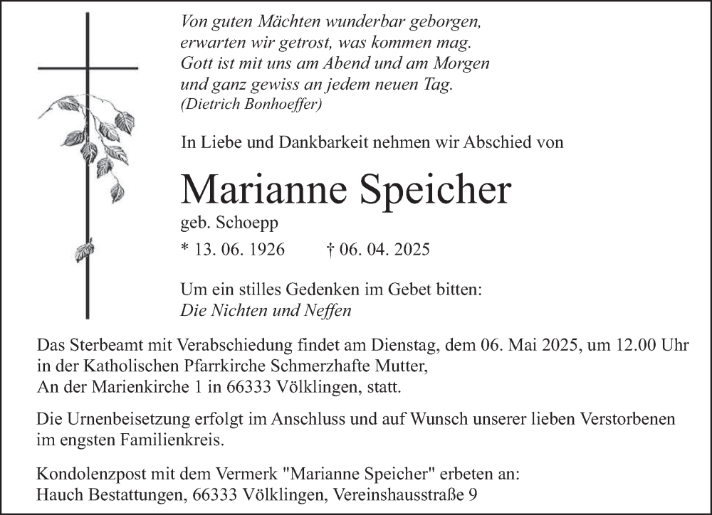 Hier finden Sie alle Traueranzeigen aus der Zeitung, die bisher für Marianne Speicher erschienen sind. Weitere Traueranzeigen, die in der Zeitung erscheinen, werden hier ebenfalls aufgelistet