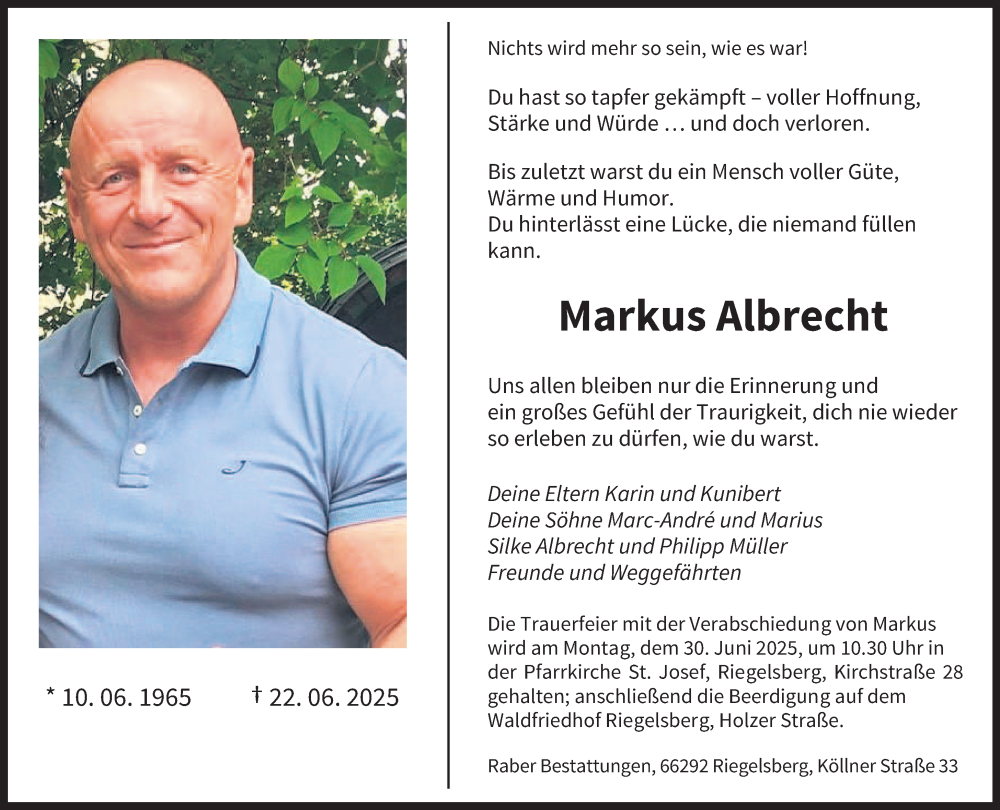 Hier finden Sie alle Traueranzeigen aus der Zeitung, die bisher für Markus Albrecht erschienen sind. Weitere Traueranzeigen, die in der Zeitung erscheinen, werden hier ebenfalls aufgelistet