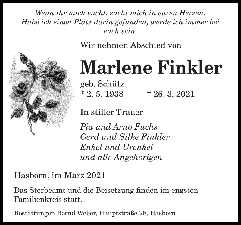 Hier finden Sie alle Traueranzeigen aus der Zeitung, die bisher für Marlene Finkler erschienen sind. Weitere Traueranzeigen, die in der Zeitung erscheinen, werden hier ebenfalls aufgelistet