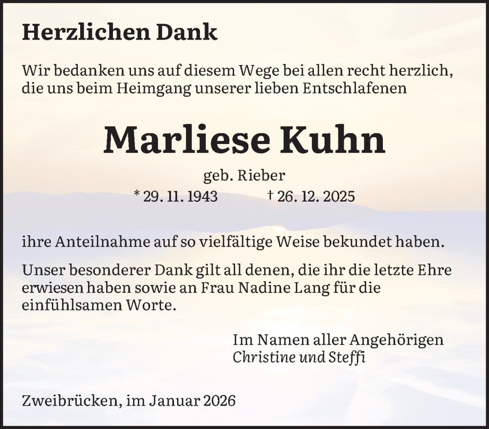 Hier finden Sie alle Traueranzeigen aus der Zeitung, die bisher für Marliese Kuhn erschienen sind. Weitere Traueranzeigen, die in der Zeitung erscheinen, werden hier ebenfalls aufgelistet