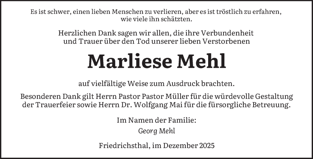 Hier finden Sie alle Traueranzeigen aus der Zeitung, die bisher für Marliese Mehl erschienen sind. Weitere Traueranzeigen, die in der Zeitung erscheinen, werden hier ebenfalls aufgelistet