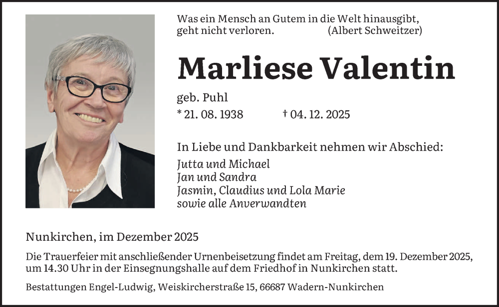 Hier finden Sie alle Traueranzeigen aus der Zeitung, die bisher für Marliese Valentin erschienen sind. Weitere Traueranzeigen, die in der Zeitung erscheinen, werden hier ebenfalls aufgelistet