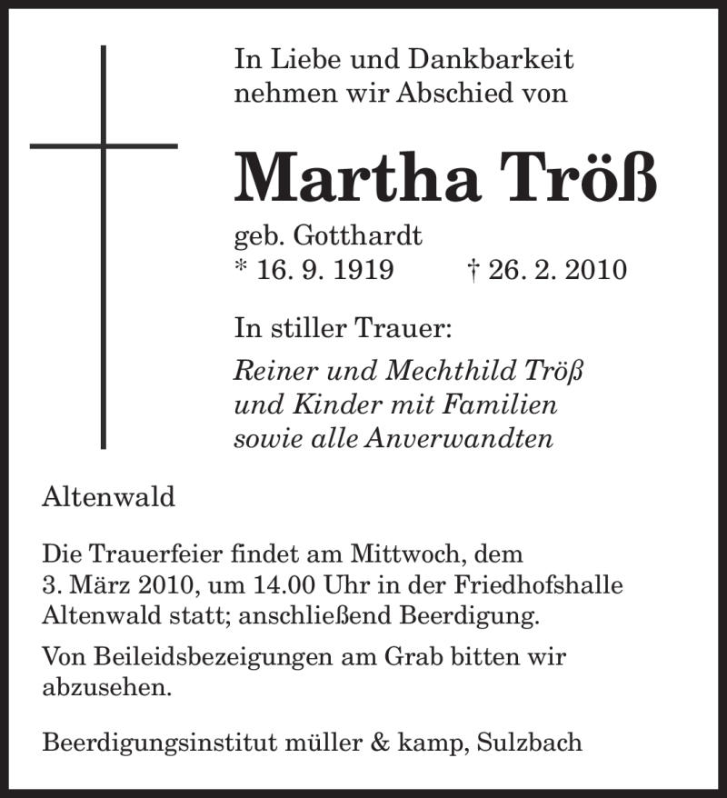 Hier finden Sie alle Traueranzeigen aus der Zeitung, die bisher für Martha Tröß erschienen sind. Weitere Traueranzeigen, die in der Zeitung erscheinen, werden hier ebenfalls aufgelistet