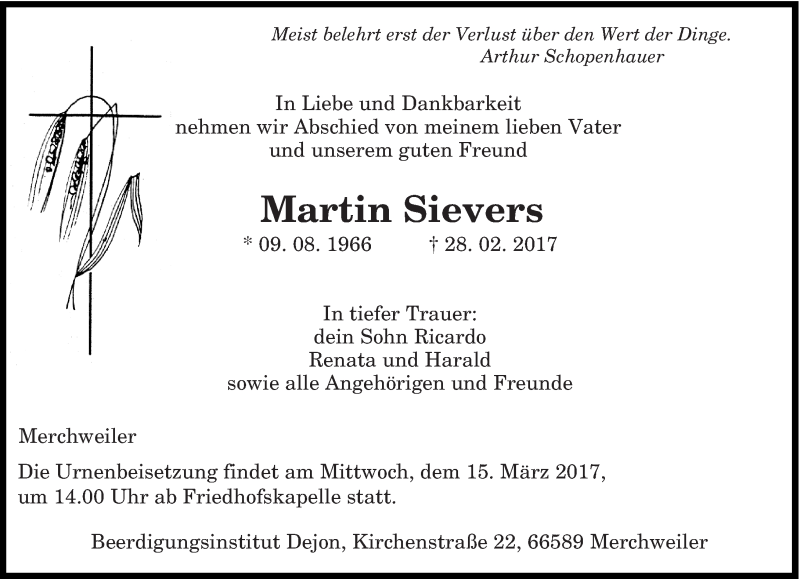 Hier finden Sie alle Traueranzeigen aus der Zeitung, die bisher für Martin Sievers erschienen sind. Weitere Traueranzeigen, die in der Zeitung erscheinen, werden hier ebenfalls aufgelistet