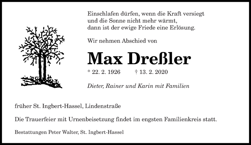 Hier finden Sie alle Traueranzeigen aus der Zeitung, die bisher für Max Dreßler erschienen sind. Weitere Traueranzeigen, die in der Zeitung erscheinen, werden hier ebenfalls aufgelistet