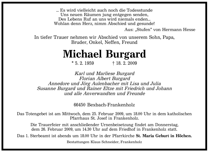 Hier finden Sie alle Traueranzeigen aus der Zeitung, die bisher für Michael Burgard erschienen sind. Weitere Traueranzeigen, die in der Zeitung erscheinen, werden hier ebenfalls aufgelistet