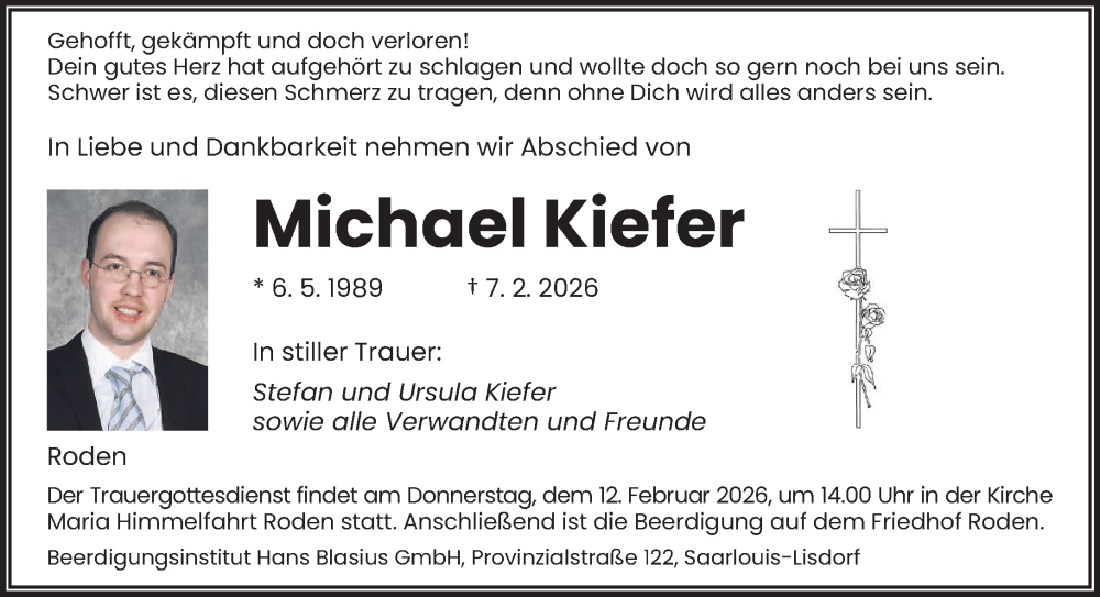 Hier finden Sie alle Traueranzeigen aus der Zeitung, die bisher für Michael Kiefer erschienen sind. Weitere Traueranzeigen, die in der Zeitung erscheinen, werden hier ebenfalls aufgelistet