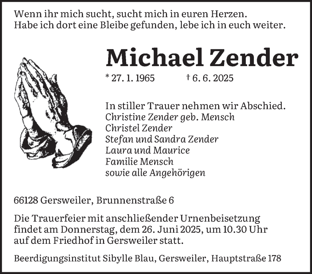 Hier finden Sie alle Traueranzeigen aus der Zeitung, die bisher für Michael Zender erschienen sind. Weitere Traueranzeigen, die in der Zeitung erscheinen, werden hier ebenfalls aufgelistet